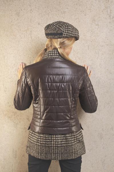 Модная куртка.Оригинальная комбинированная куртка актуального дизайна – спереди имитация пиджака с отложным воротником и застежкой на кнопки. Верхнюю часть завершает аккуратный воротник стойка. Линия талии подчеркнута поясом. Длинные рукава оформлены стеганой строчкой. Перед декорирован рисунком в клетку. Карманы прорезные с клапанами.Р-ры в наличии 44, 46, 48, 50, 52