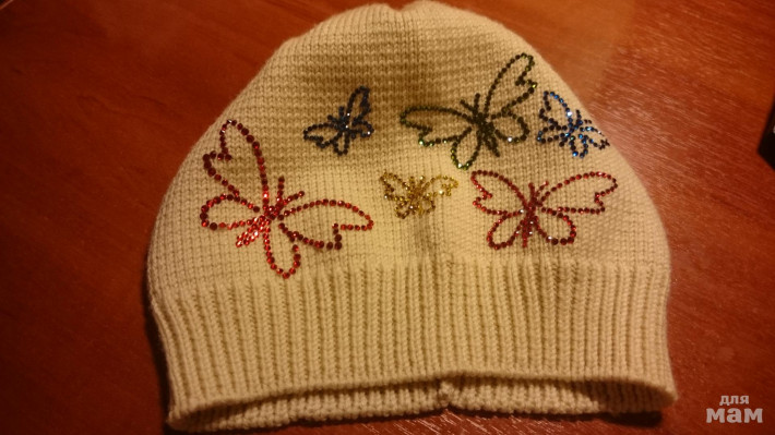 Одна из самых красивых шапочек. Бабочки сияют, переливаются всеми цветами радуги. В идеале. Успели одеть 2 раза. До 50 см