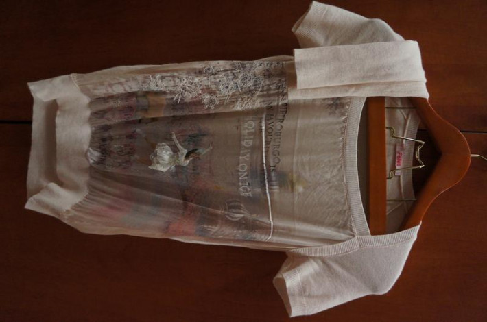 Б/у один раз. Свитер длинна 68 см, под мышками 39, рукава прилагаются. Перед шелк с эластаном, все стразы на месте. Спина и рукава ангора с полиэстером и вискозой.