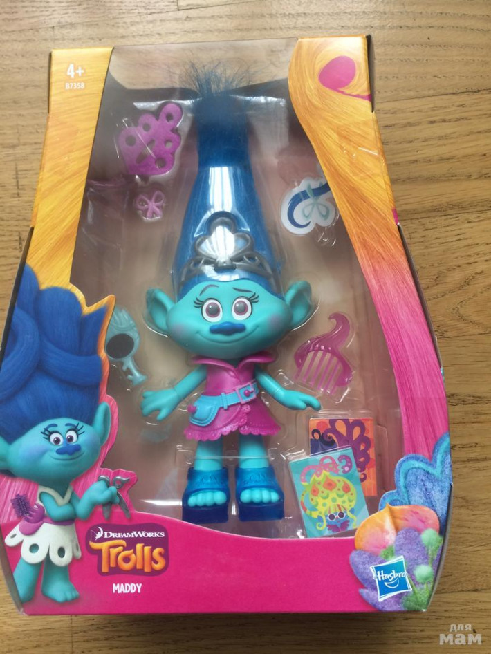 Тролль 22,5см высотой, включая роскошные, плюшевые волосы. В ассортименте 6 героев, специальная расческа, стикеры и петля для причесок, одежду и обувь можно снимать.