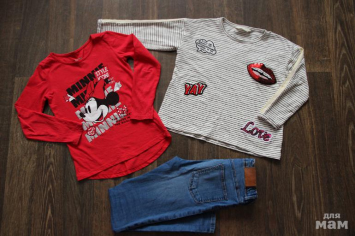 Кофточка красная с минни размер 116, 300 руб. кофточка Mango с губами, очень классная, размер 116, 450 руб. Обе кофты одевались по разу, в идеальном состоянии. Джинсы фирма Zara размер 122, можно раньше. Очень удобные, тянутся, модель скинни, есть утяжки. В идеале. Цена 700 руб.
