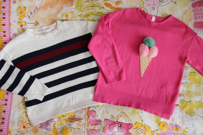 Свитерочки очень мягкие и приятные, размер 122, в идеальном состоянии, одеты один-два раза, слева Mango с темно синими полосками, справа Acoola, очень яркий и классный. По 550 руб.