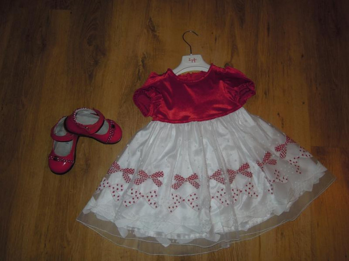 Платье шила на заказ из итальянской ткани Monnalisa. Одели 2 раза. Состояние идеальное. Туфли к платью Vitacci, размер 23 (стелька 15,2), состояние отличное. Всё вместе отдам за 2500р. При желании, к наряду есть ободок.
