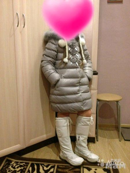 Продам пуховое пальто для девочки Б/У рост от 128 до 134.очень теплое .состояние отличное .под нее есть сапоги дутики аляска стального цвета и белые мембранные как на фото