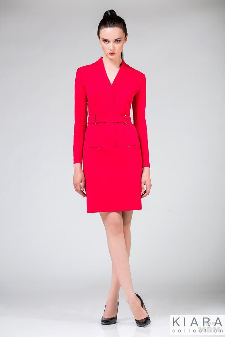 Платье женское, из текстильного материала, полуприлегающего силуэта, длинной выше линии колена, рукава- втачные, длинные. Перед с фигурными бочками, с нагрудными вытачками, в области бедер подрез, в шве соединения которого карманы с застежкой на потайную тесьму-молнию, по горловине планка доходящая до подреза. Спинка со средним швом, с рельефными швами в нижней части переходящими в вытачки. Платье дополнено поясом с металлическими пряжками.