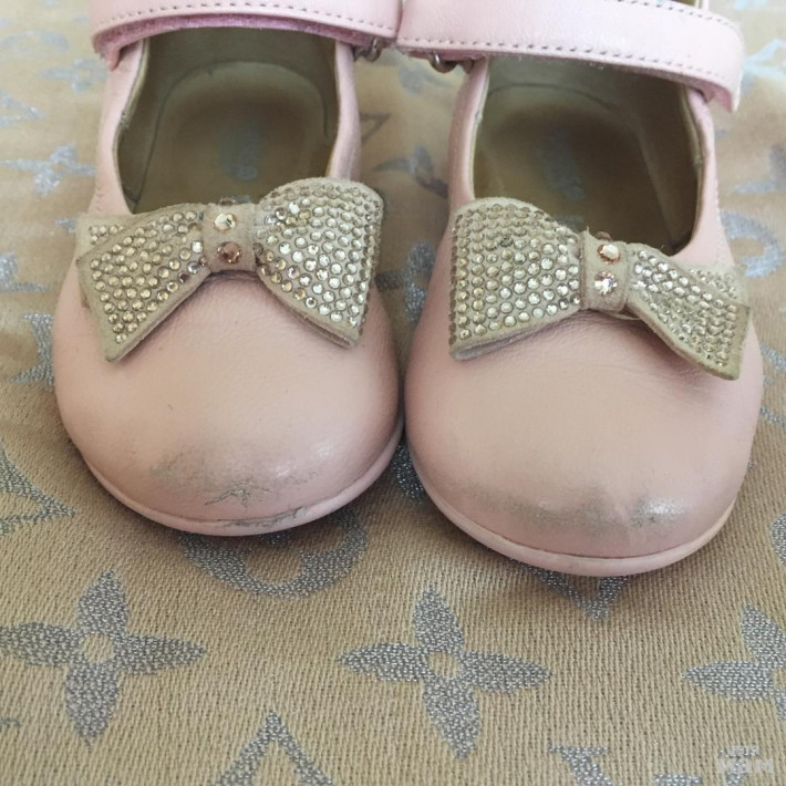 Туфли активно бу, но состояние хорошее, смотрите фото, только потёртости на номах, в глаза не бросается. Стразы все на месте. По стельке 15,5 см