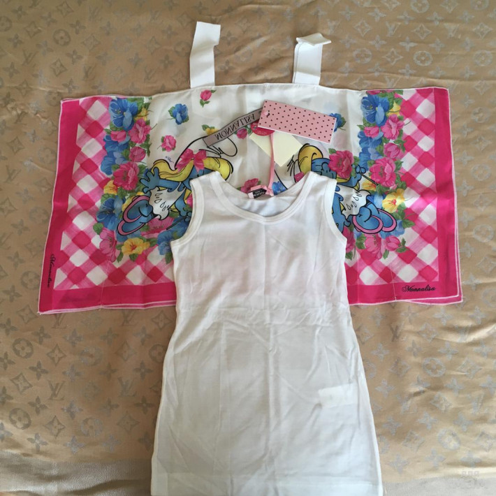 Новая туника смурфы, 4 года, 104 см. Можно раньше как платье. Очень яркая и красивая! Состоит из 2 частей, майка вискоза и топ шёлк . Отдаю за 2500