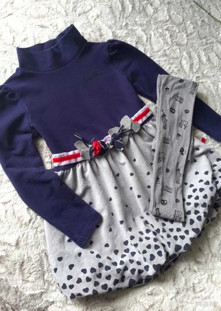3. Теплое платье синий с серым, маркировка 114 см, длина 52 см, грудь 33 см, горловина не растянута (изначально широкий крой), колготы в придачу, 350 руб