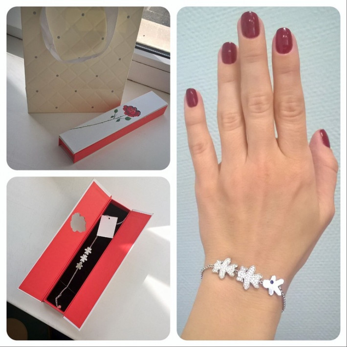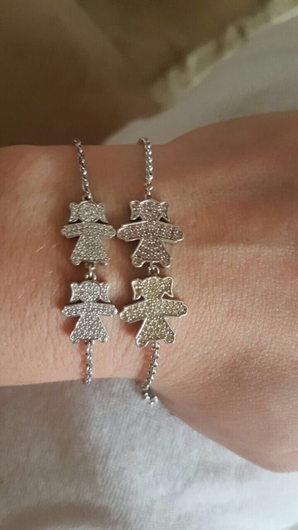 Наглядный пример! На фото два браслета-золото с бриллиантами от знаменитого ювелирного бренда,который один из первых стал изготавливать символы материнства и наш браслетик из серебра с родиевым покрытием с фианитами бриллиантовой огранки.