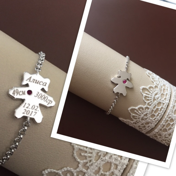"Бриллиантовая" малышка вошла в летопись нашей компании! Серебро 925 пробы с родиевым покрытием с инкрустированным бриллиантом 0,03 карата ,чистотой 3/4. На обратной стороне фигурки гравировка имени,вес,рост и даты рождения.