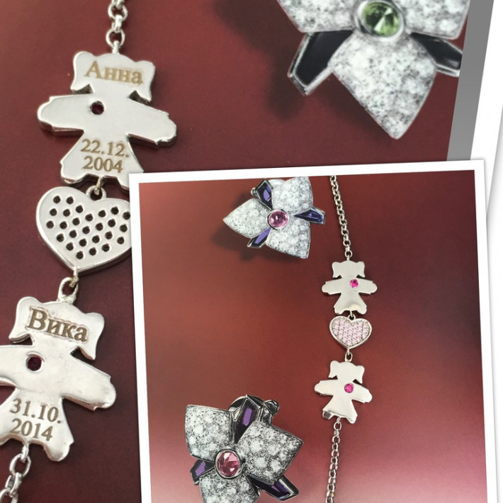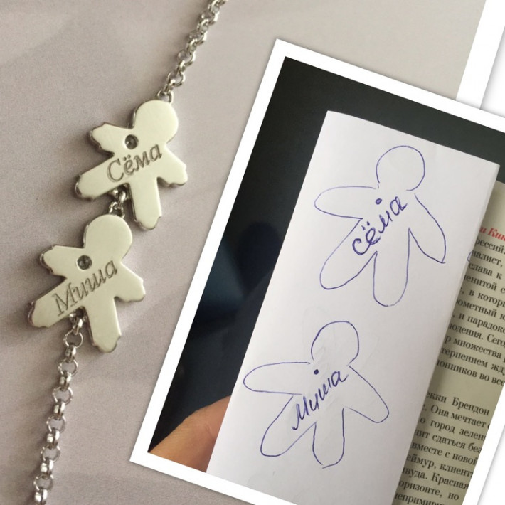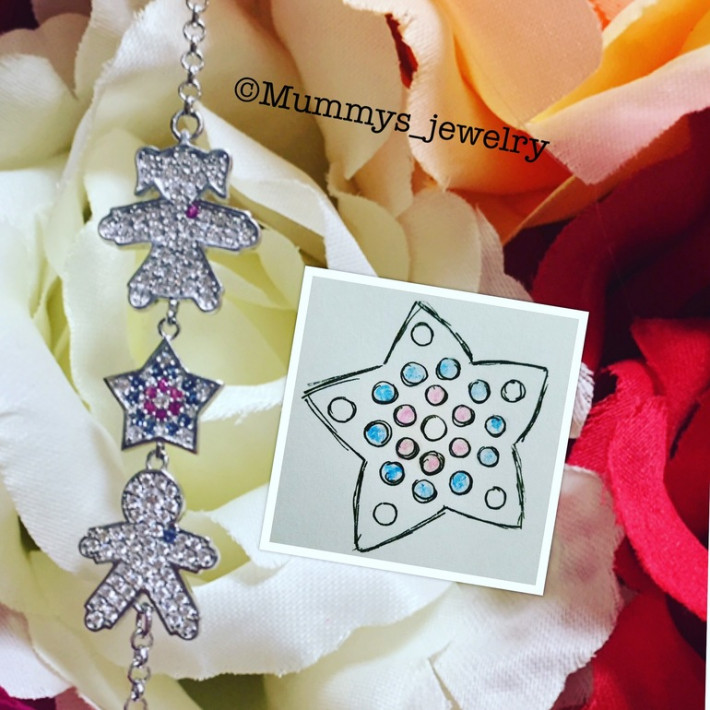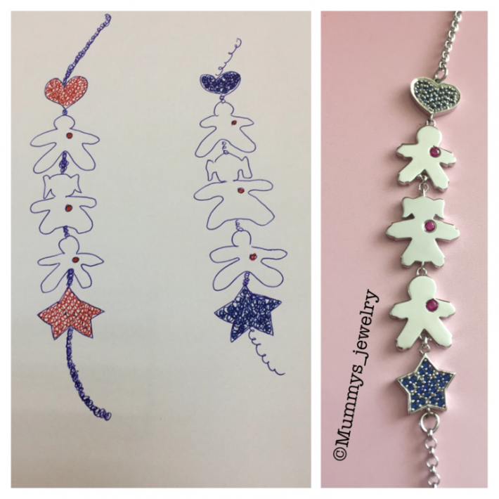 Обладая навыками ювелирных технологий и специализаций ,наши ювелиры готовы тонко уловить желание заказчика . Достаточно нарисовать на бумаге или прислать фото желаемого браслетика и Вы получите эксклюзивное изделие ,выполненное в единственном экземпляре. (Примеры готовых работ,выполненных по рисункам мам).