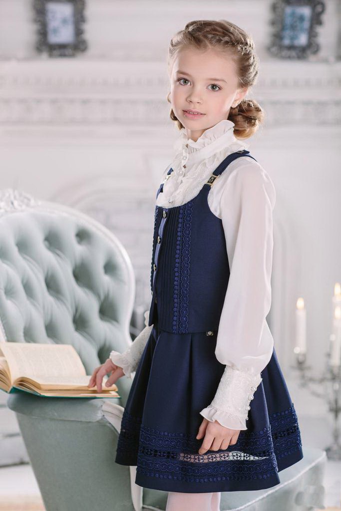 Стильный приталенный школьный жилет для девочки синего цвета, тонкие брительки регулируются по длинне спереди и дополнены пряжками с золотистым изображением совы, планка украшена кружевом в тон основной ткани, сзади есть вставка из трикотажного полотна для большего комфорта в носке и лучшей посадки.