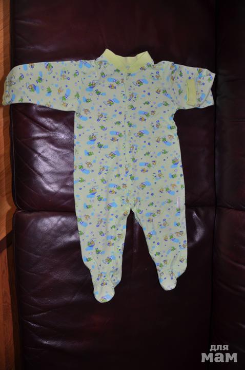 Продаю хлопковый комбинезон-слип с ножками зеленого цвета с рисунком в виде жужиков всяких. Застегивается полностью на кнопочки. Чуть две кнопочки отошли от ткани между ног. Размер 80 см, но лучше до 76 см. Состояние хорошее, не считая вот тех двух кнопочек.