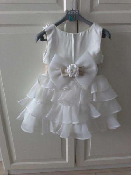Платье в отличном состоянии,одевалось считанные разы на НГ праздники.Внутри х/б подклад,подъюбники,сзади шикарный бант золотой.Маркировка 110,но мах до 104см.Длина-53,грудь-28