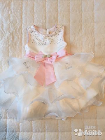 Нарядное белое платье на хб подкладе. Верх украшен стразами, красивый бант на талии, сзади регулируется лентой объем. Платье воздушное и очень нежное.