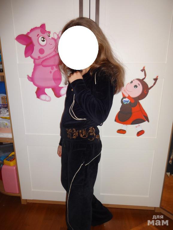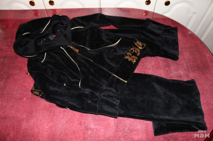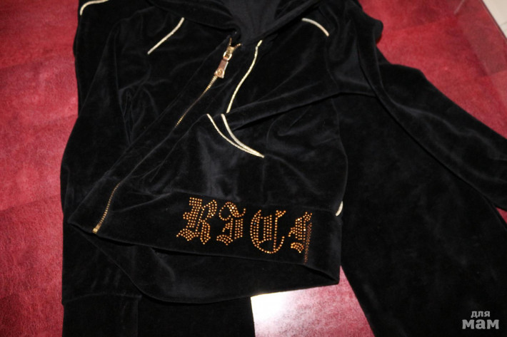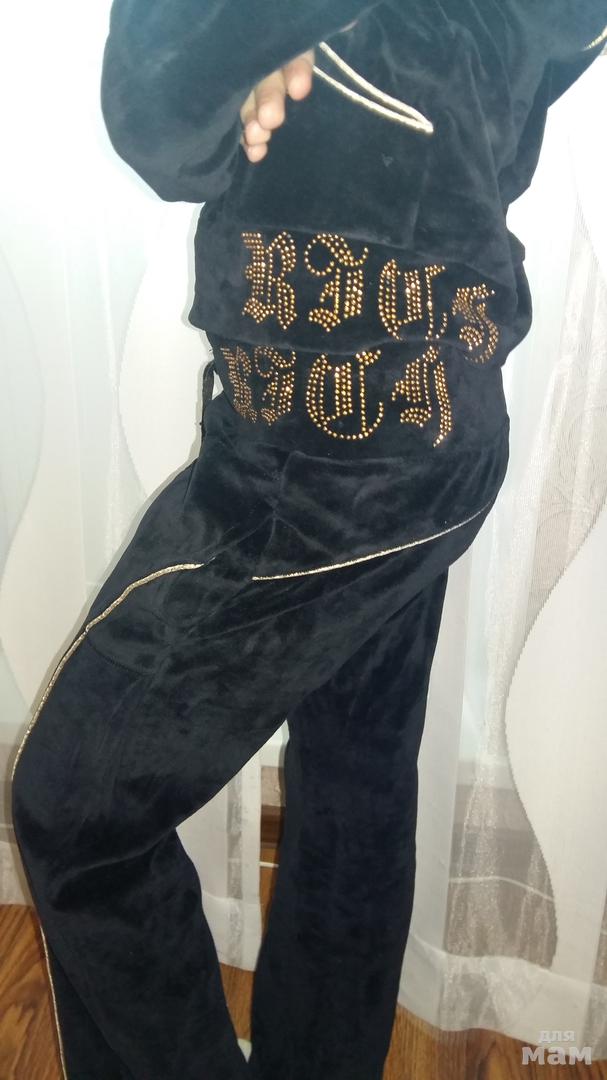 костюмчик красивый, насыщенный черный цвет, ОЧЕНЬ красивые надписи из страз на талии брюк и кофты! кофта укороченная, специально чтобы было видно стразы. Талию можно утянуть!