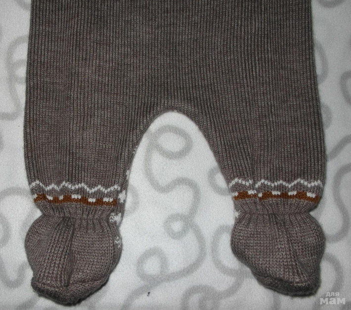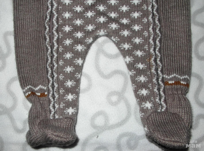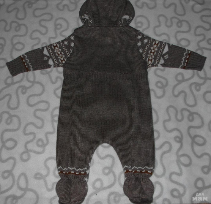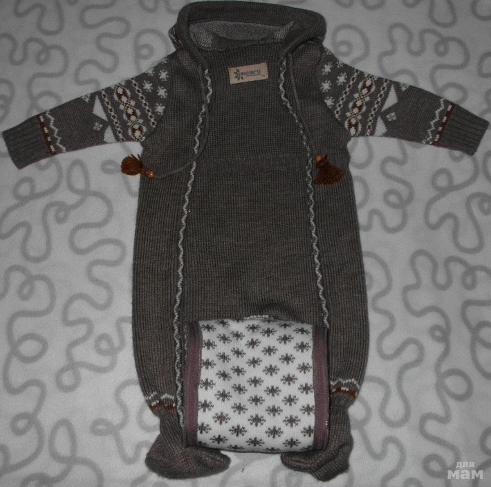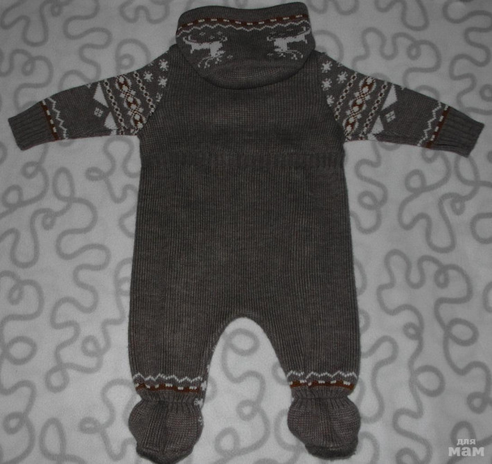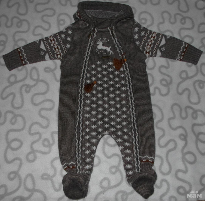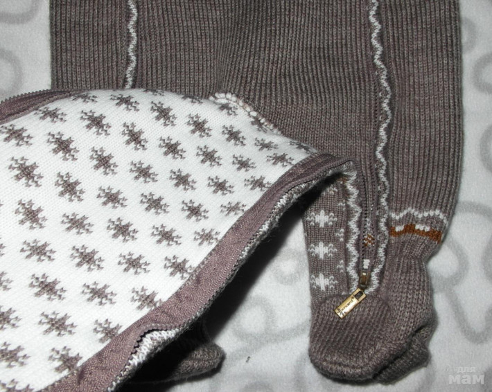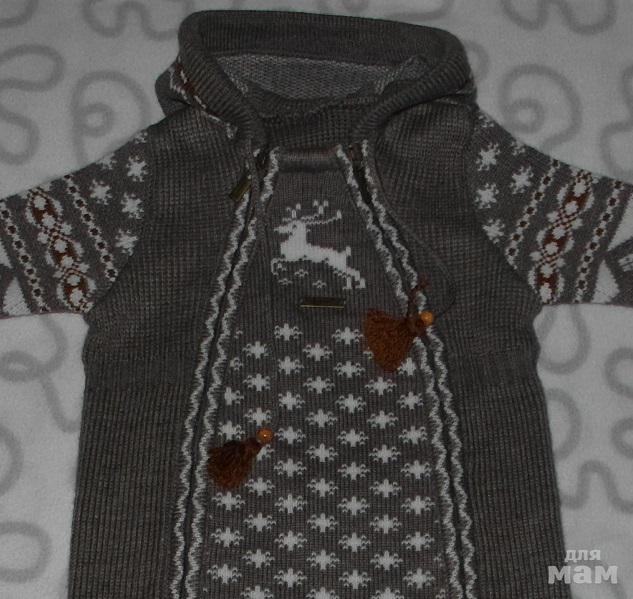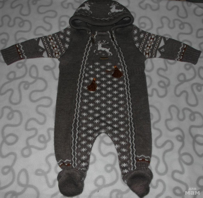 Комбинезон украшен традиционным вязаным орнаментом. Застегивается на две молнии, что обеспечивает удобное одевание малышей.