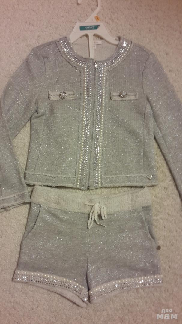 Наш самый любимый костюмчик...оригинал...Весь усыпан стразами, горит огнем....Состояние оч.хорошее, все камни на месте...Жакет размер 5, шорты р.4 ...хорошо на рост 110 см..можно раньше и позже.