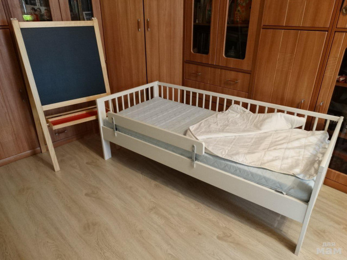 Кровать Гулливер с бортиком, реечным дном султан ладе и двусторонним матрасом висса винке с наматрасником + мольберт Мола.