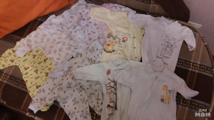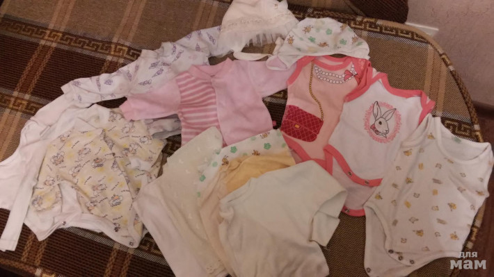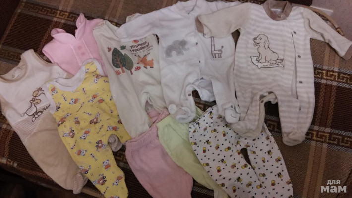 8.Продам пакет одежды для девочки от 0 до 3 месяцев на рост от 50 см до 56 см. Состояние вещей хорошее. Некоторые вещи абсолютно новые. В пакет входит: 9 шт комбинезонов трикотажных, 2шт. велюровых комбинезонов, 3шт ползунков, 1шт велюровый комбинезон, 1шт флисовый комбинезон, 2шт трикотажных комбинезонов, 2 чепчика, 3шт боди с длинным рукавом, 2 кофточки, 5 шт классических распашонок, 3 шт боди с коротким рукавом. Цена 1200 руб.