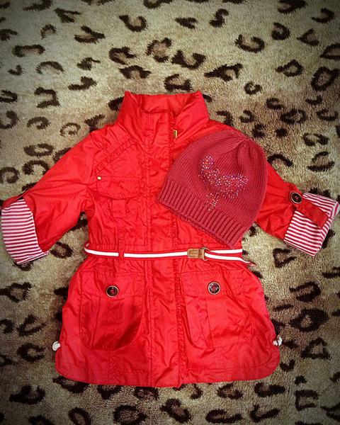 Продам стильную ветровку для девочки на 2-3.5 года .Цвет морковно-красный.В воротничке спрятан капюшон.Состояние идеальное.