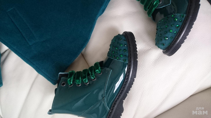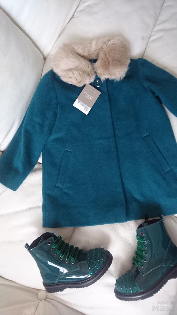 Цвет очень красивый, изумрудный, фото НЕ ПЕРЕДАЕТ ЦВЕТ. Цвет как на каталожном фото. В составе шерсть, подкладка тоже очень красивая и натуральная. Ботинки не продаются, могу поставить в бронь тому кто купит пальто, у нас такое же пальто большего размера. Ботинки необычайной красоты, лак, замша с изумрудными камнями и бархатными шнурком. комплект смотрится очень красиво.