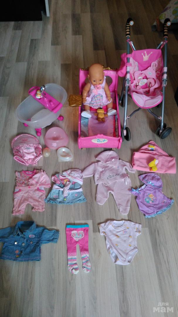 Коляска трость,кроватка музыкальная,горшок,тарелка ложка,ванна музыкальная,кенгуру переноска,комплект одежды,пупс нажимаете на пупок писает,ест,кушает,можно купать,