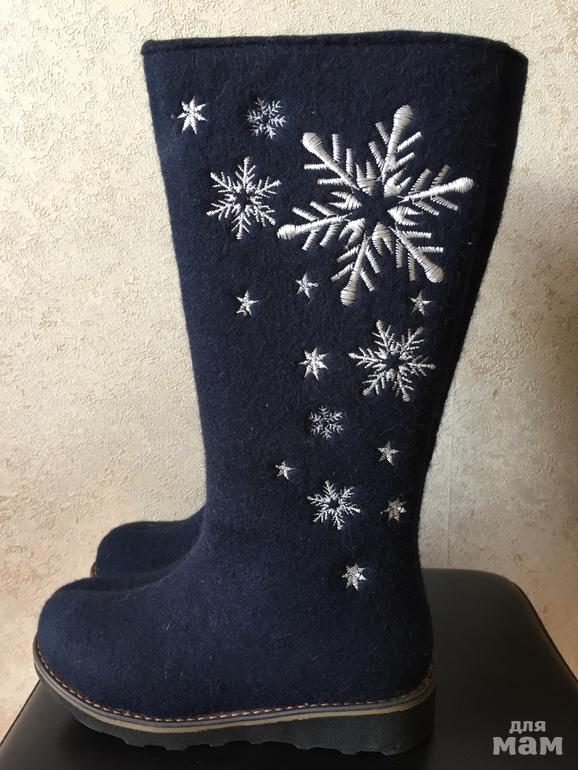 Красивые валенки (войлок) темно-синего цвета,на молнии с белой вышивкой. На широкую ногу не подойдут, хорошо сядут на среднюю полноту и худую ступню. Размер на валенках указан 32, по стельке 21 см ровно! 1000р