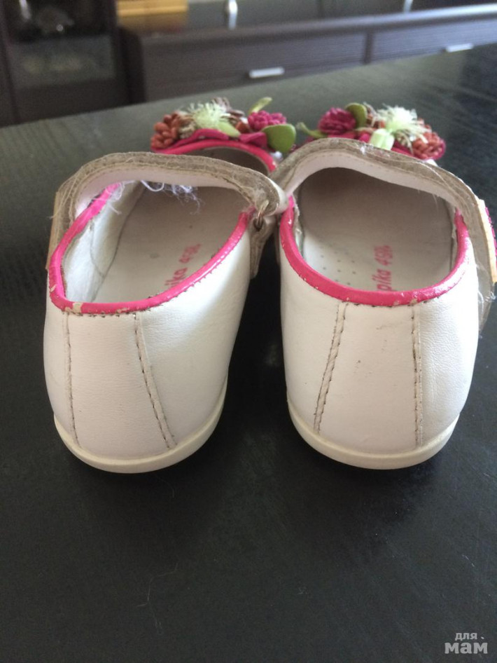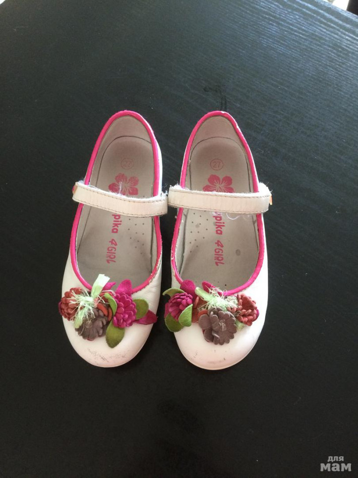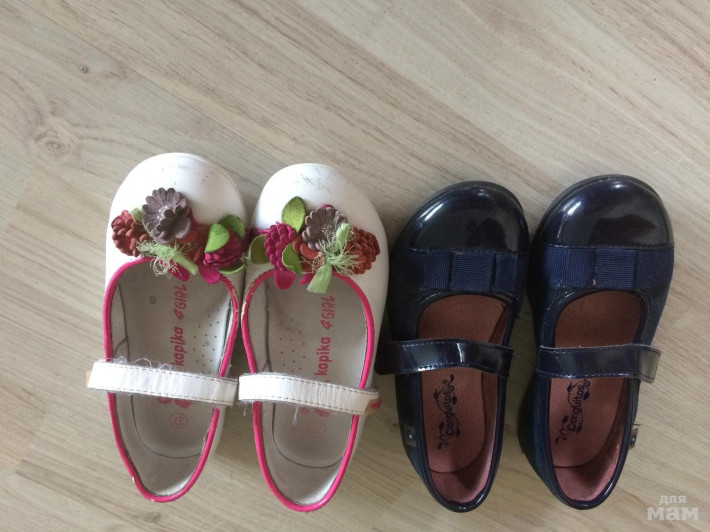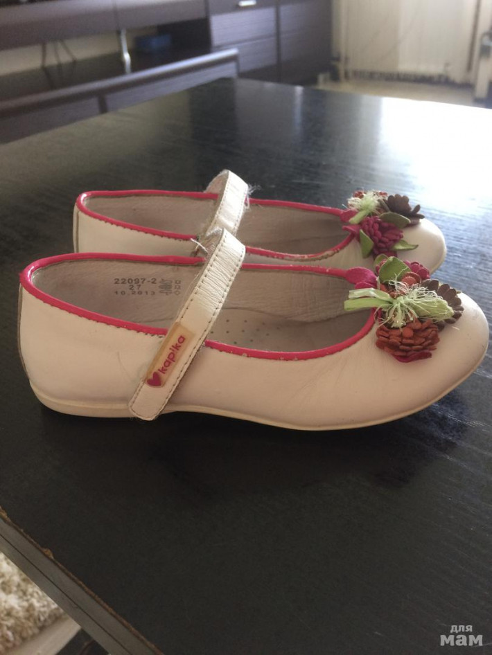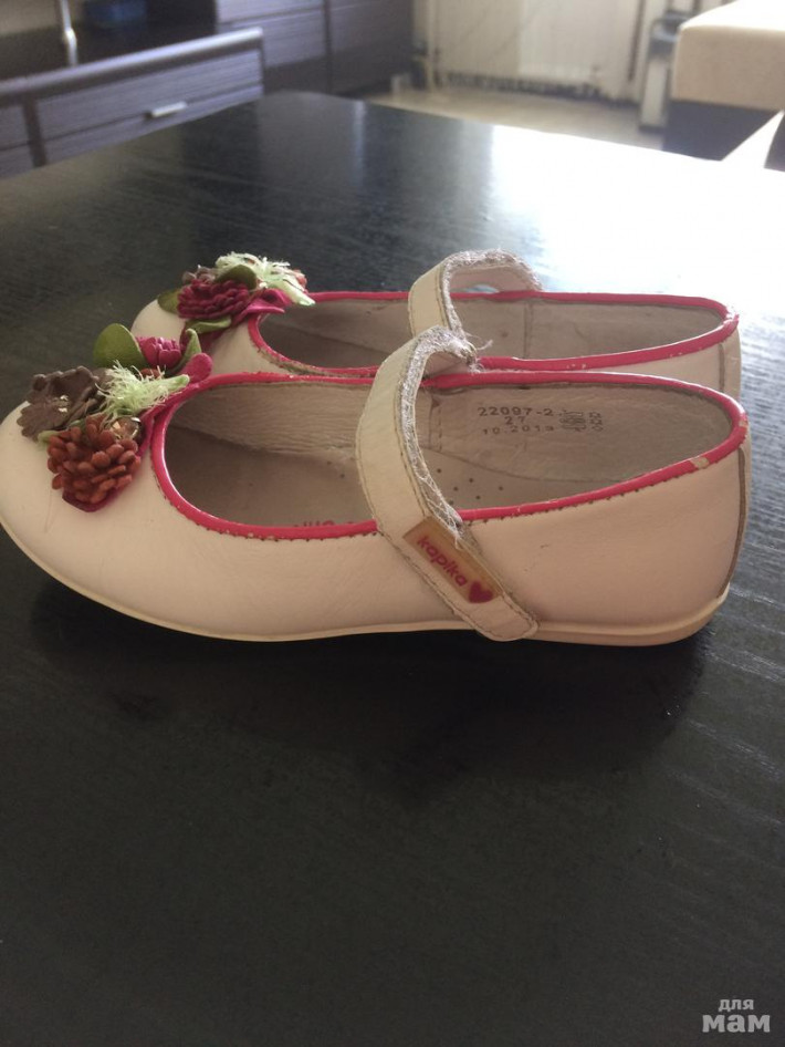 2.Туфельки Капика, в хорошем состоянии, носили на сменку в садике одну весну. За лето выросли из них. Носики немного поцарапаны, легко можно закрасить кремом). Кожа полностью. Стелька 17.5 см. Цена 500 руб.Продано!