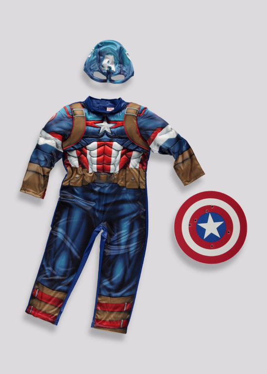 Костюм Капитан Америка Captain America фирмы Matalan. Слитный шикарный костюм с мышцами, сзади застежки липучки. На груди зажигается звезда. В комплекте маска и щит. ПРОДАН