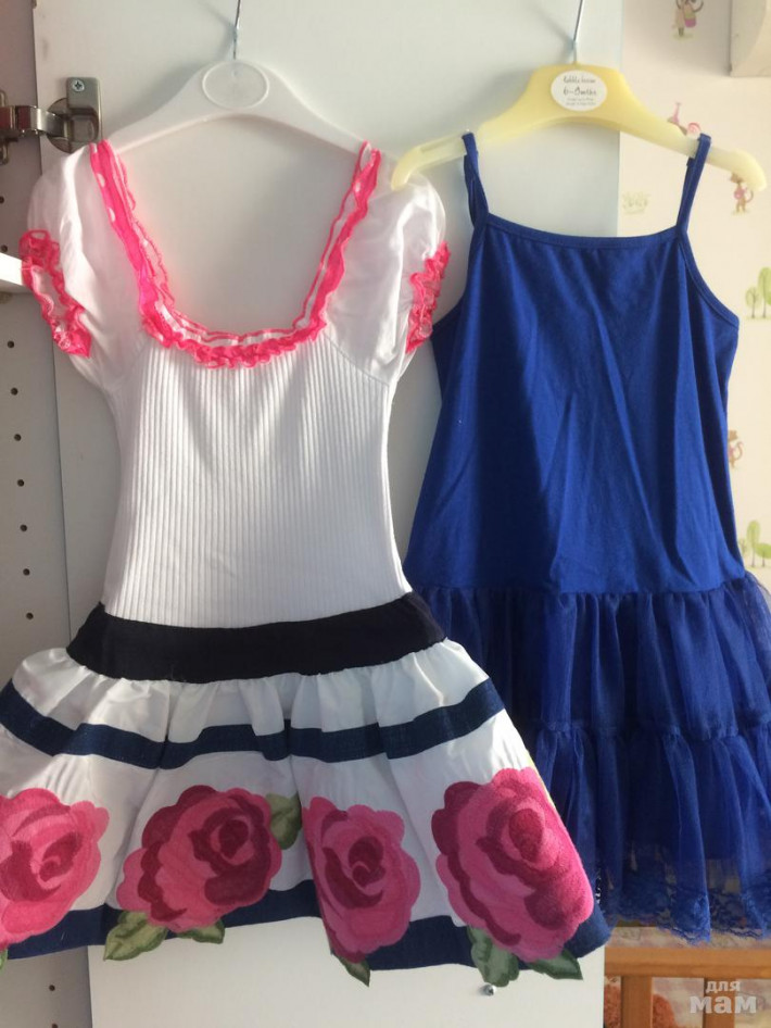 1) Платье с розами De Salitto, размер 104. Состоит из двух предметов - само платье с красивейшим шитьем и подьюбник в виде платья, который можно использовать и с другими платьями. Хорошо тянется в талии. Замер платья: длина 52, ширина 22 в нерастянутом состоянии.Цена 1200 руб