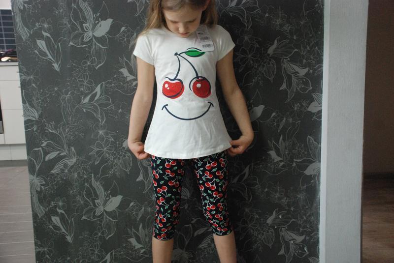 ДД! Мазеркеа в состоянии новых (постирали и не носили) р.98. Футболка как на фото, салатовая, красная с принтом яблоки. Лосины укороченные как на фото, в вишенки как футболка с фото, красные. Каждая вещь 350 руб. Или весь набор (6 вещей) за 1800