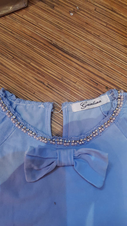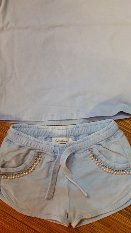 Комплект шорты+майка Gaialuna, размер 110см. Цвет ,как на первом фото, светло-голубой. По горловине и кармашкам- стразы и жемчуг. Очень нарядный комплект! Состояние : майка - отличное, шорты сзади чуть зацепки, смотрите нижнее фото. Цена комплекта 1000руб. ( покупала за 65 евро)