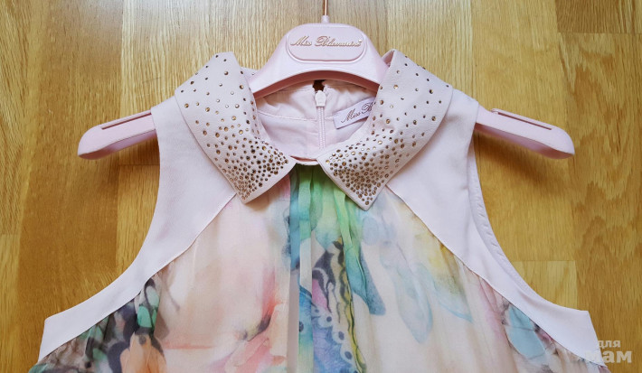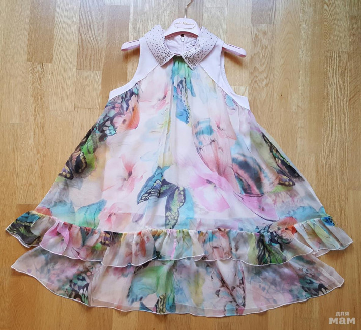 Шикарное платье Miss Blumarine.Воротник из крепа со стразами. Без рукавов. Потайная молния сзади. Многослойная панель с рюшами из шелковой вуали. Рюши по нижней кромке. 100% шелк. Подкладка из хлопкового муслина. Маркировка 10, на рост 134-140см. Б/у 2 раза, отличное состояние. Никаких нюансов!!! 5000 + почта 6000р