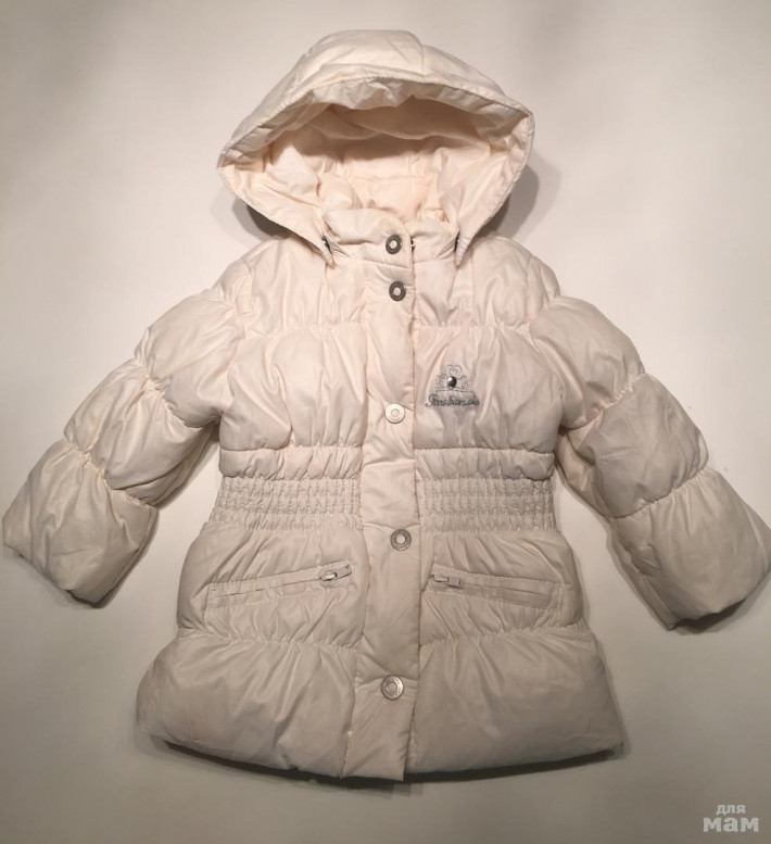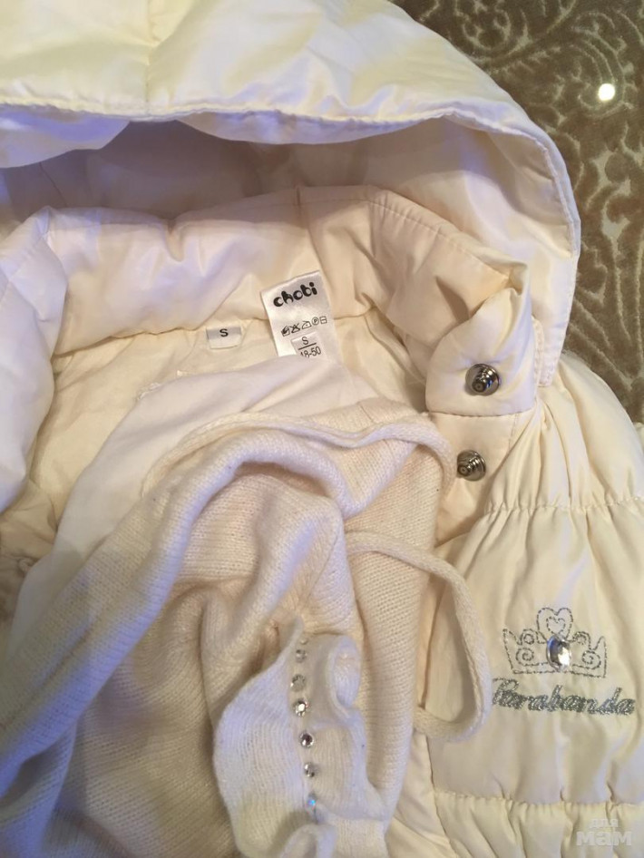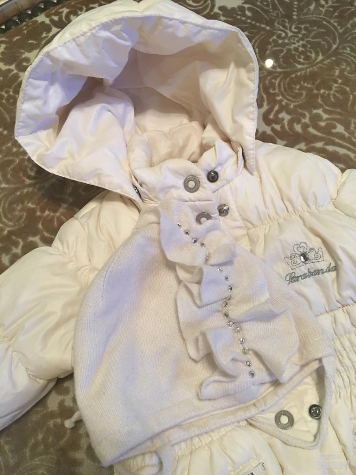 Куртка-пуховик на полтора года ! Наполнитель гусиный пух . Подойдёт на девочку 1,5 -2,5 года , мы одевали в 2,5 года ( так как худенькие ) . Пальто Без дефектов . В комплекте с шапочкой идеально смотрится !
