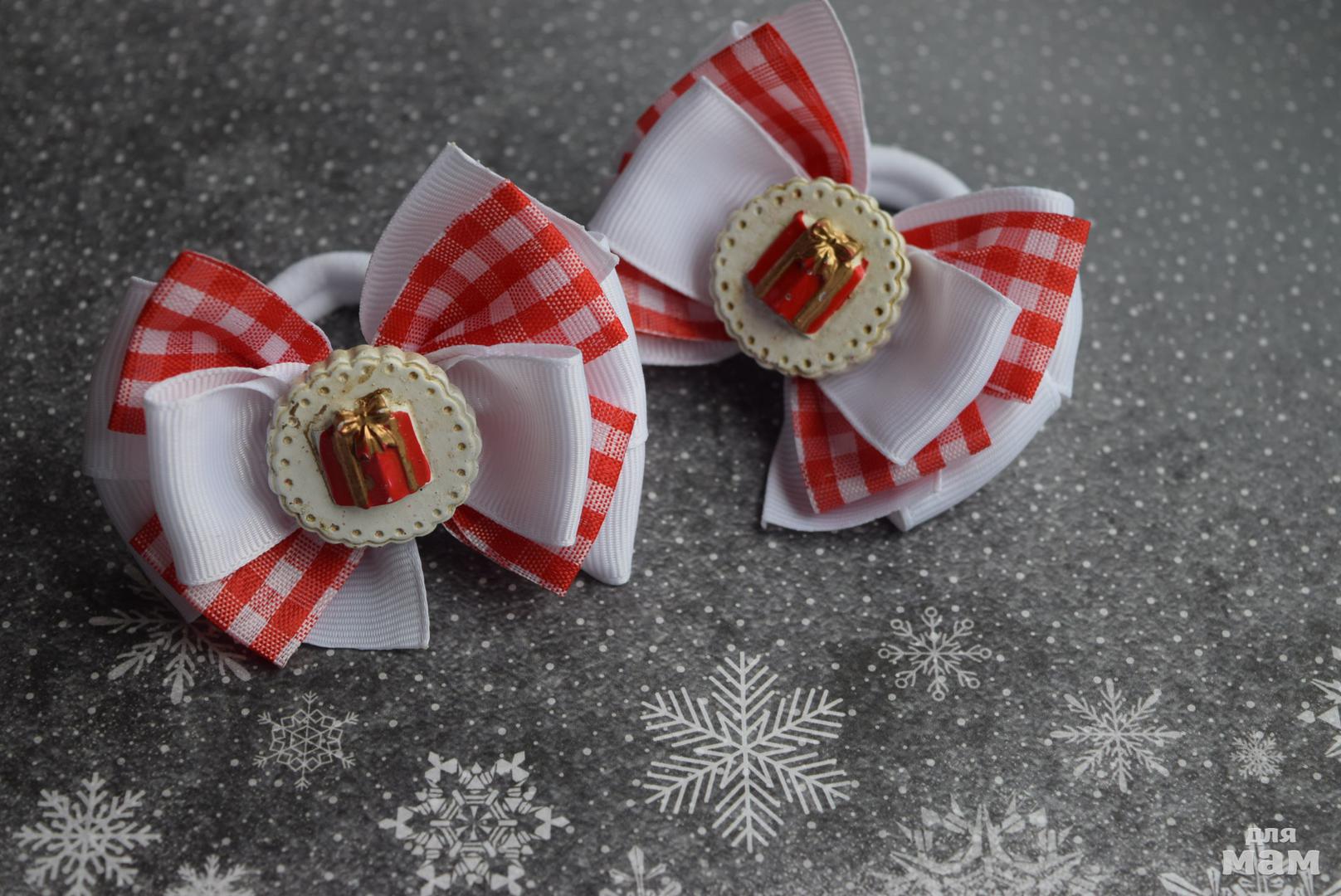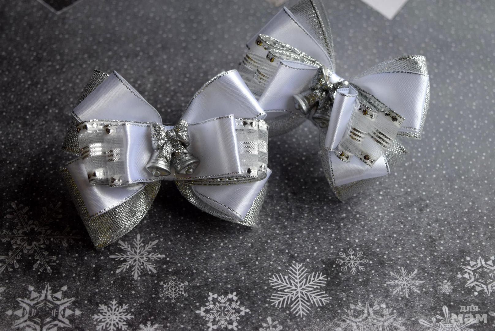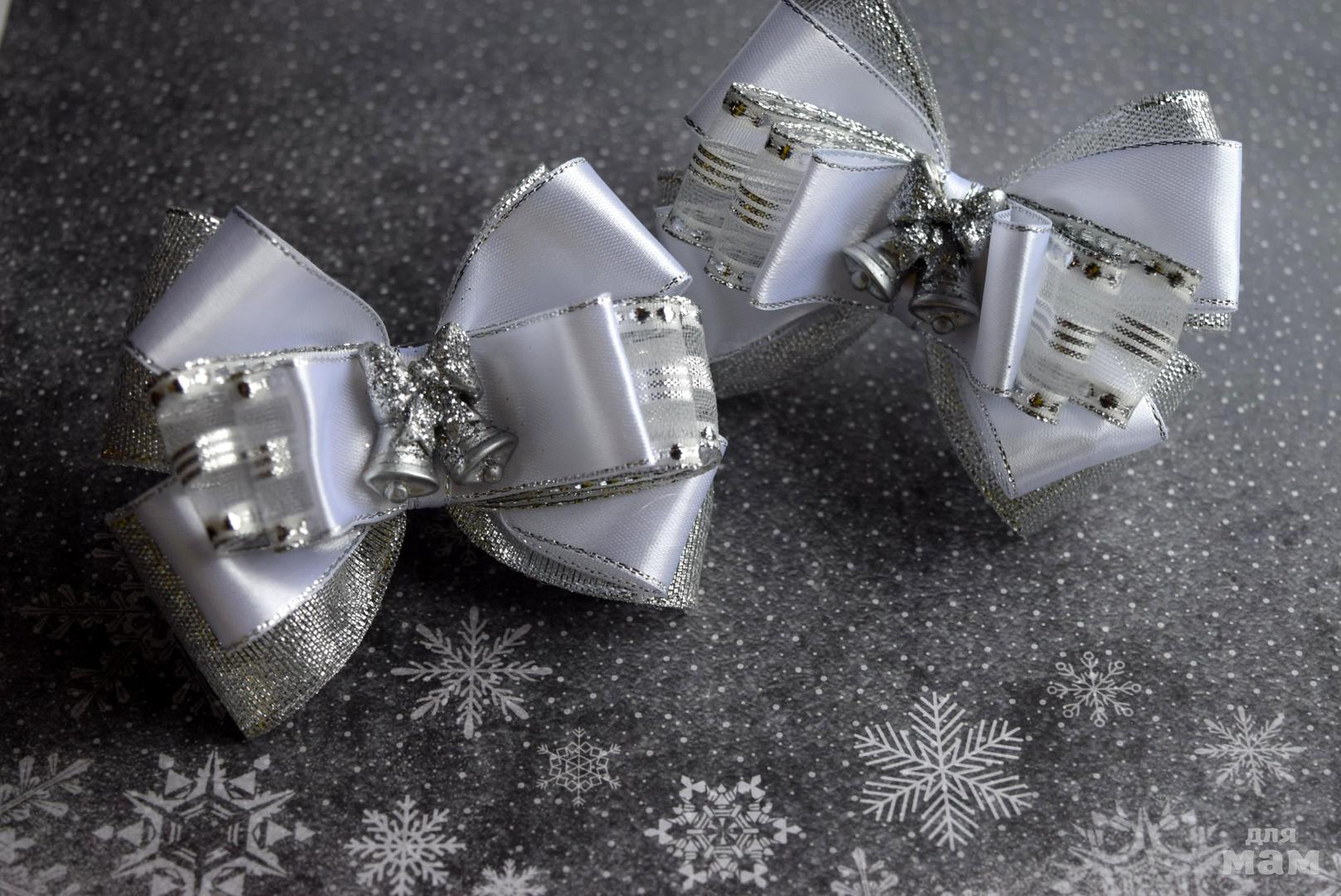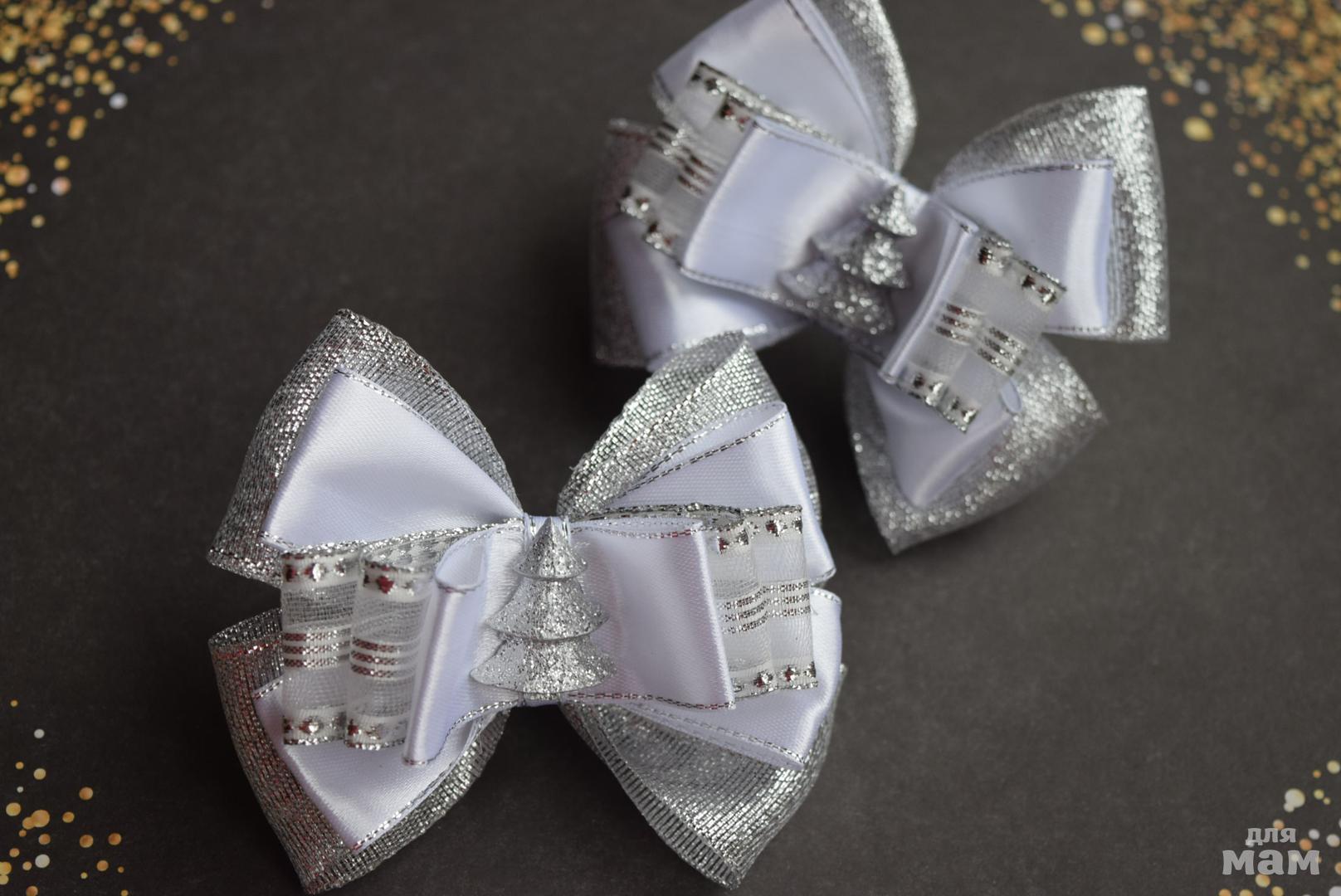 Большие нарядные бантики с заснеженными елочками станут отличным украшением новогодней прически.