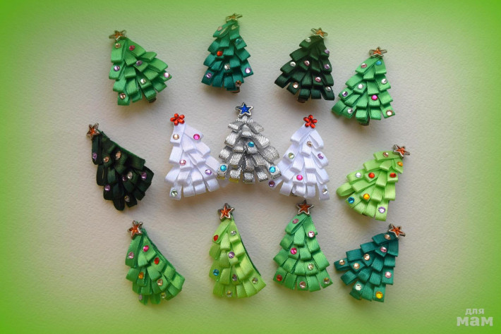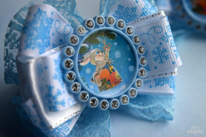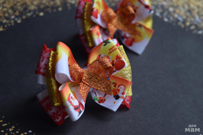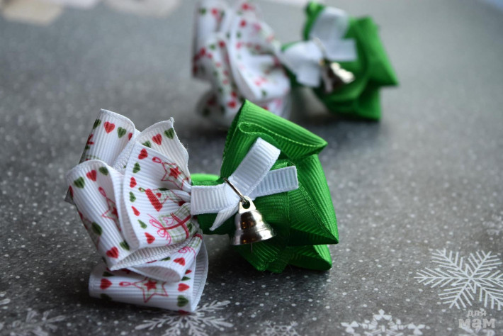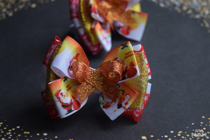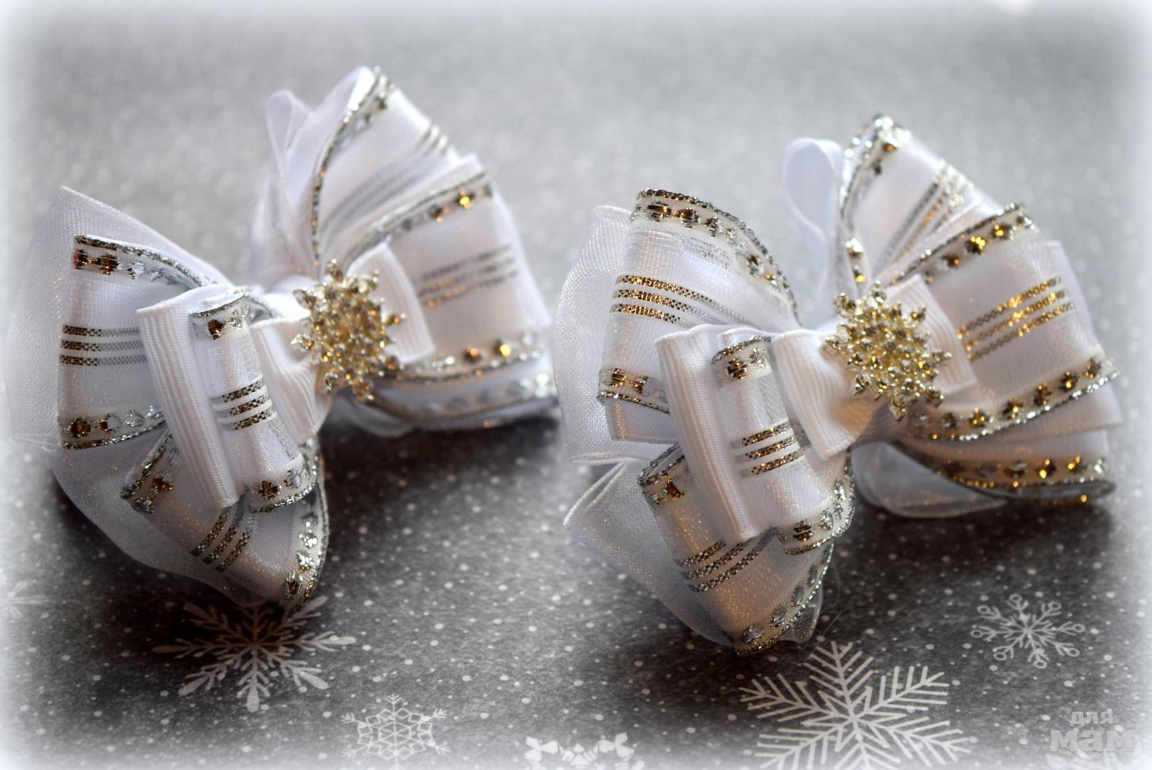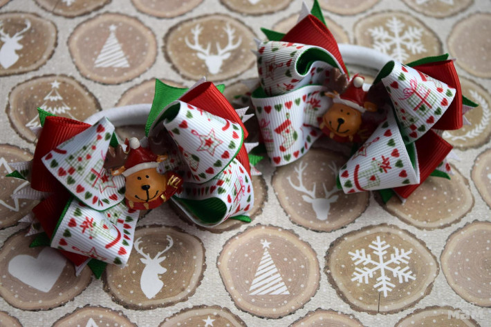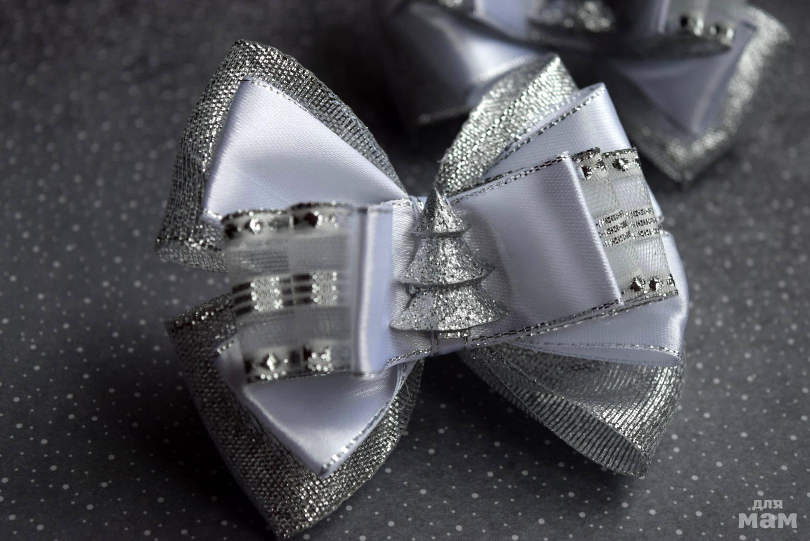 Большие нарядные бантики с заснеженными елочками станут отличным украшением новогодней прически.