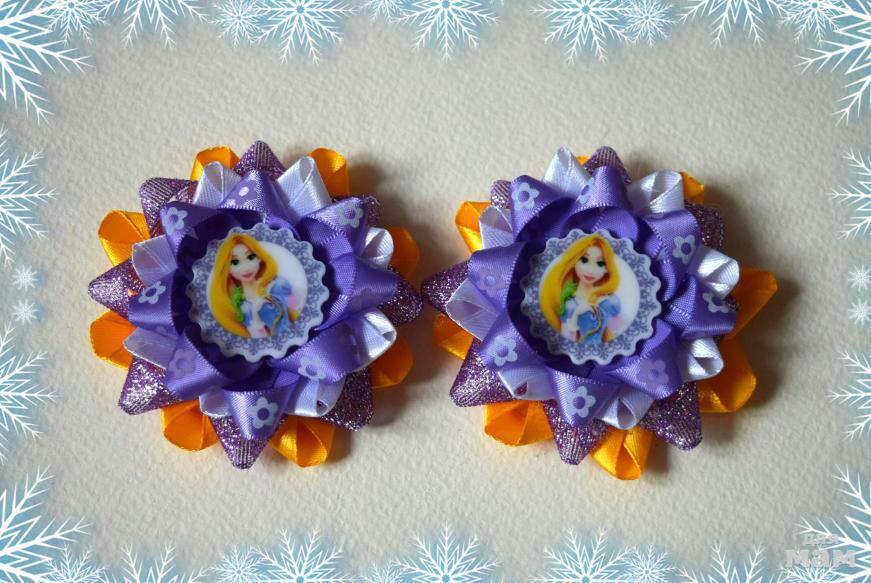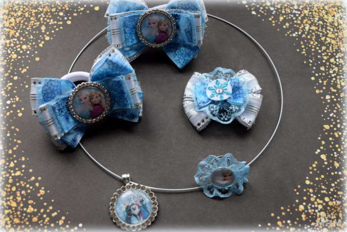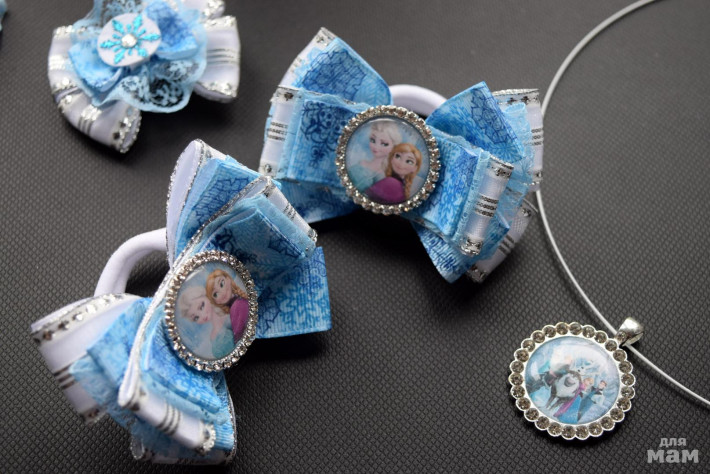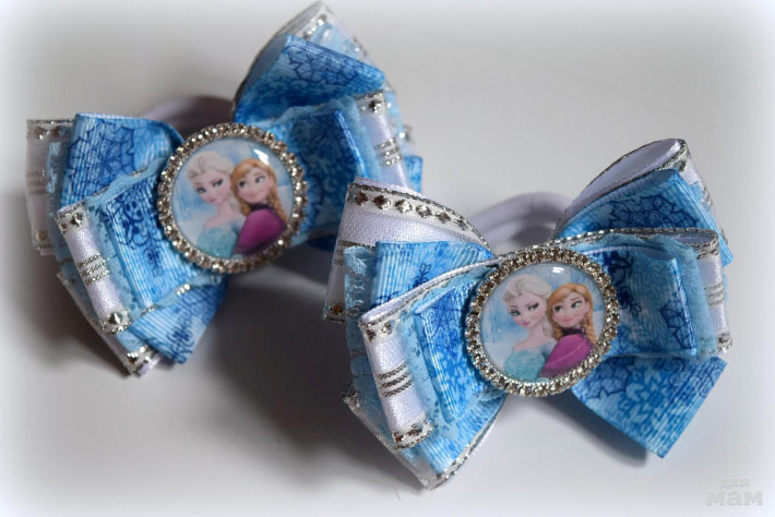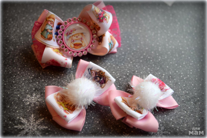 Бантики из кружева, парчи и репса с тематической картинкой. Бантики яркие и очень нарядные.