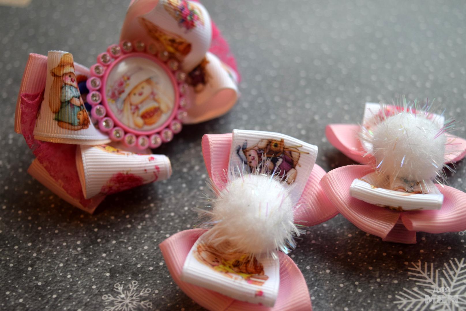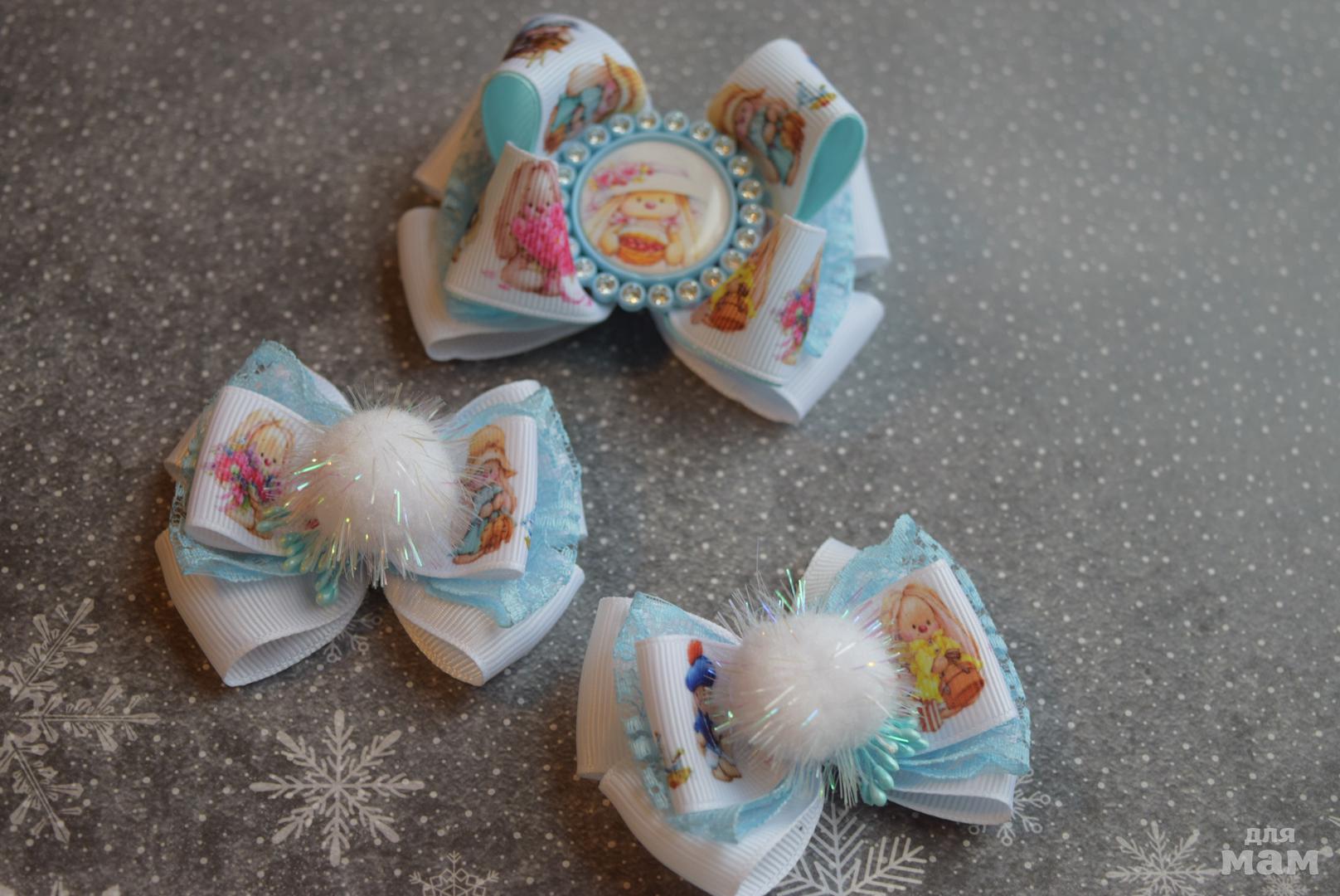 Бантики из кружева, парчи и репса с тематической картинкой. Бантики яркие и очень нарядные.