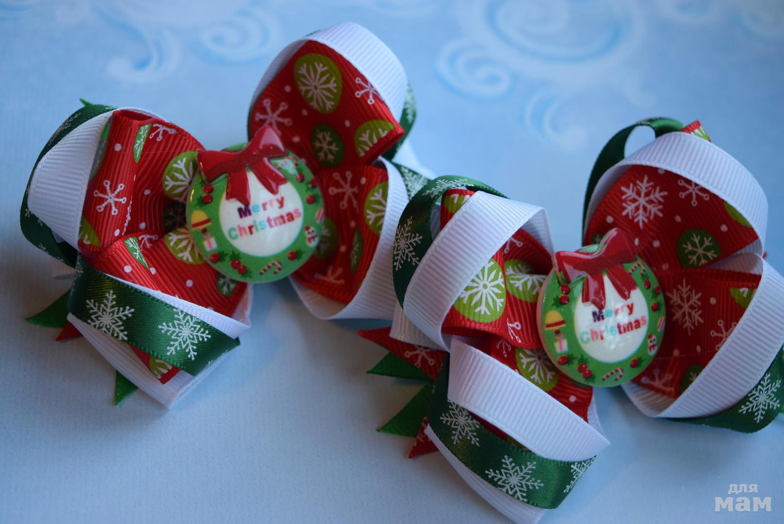 Большие нарядные бантики с заснеженными елочками станут отличным украшением новогодней прически.