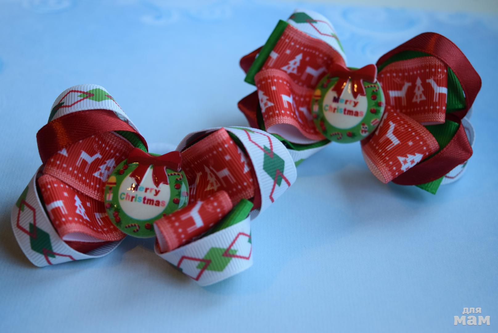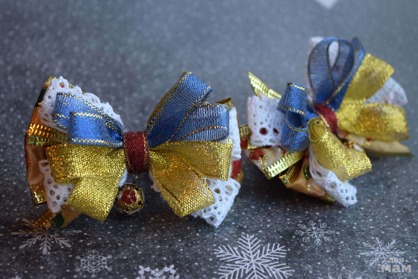 Большие нарядные бантики с заснеженными елочками станут отличным украшением новогодней прически.