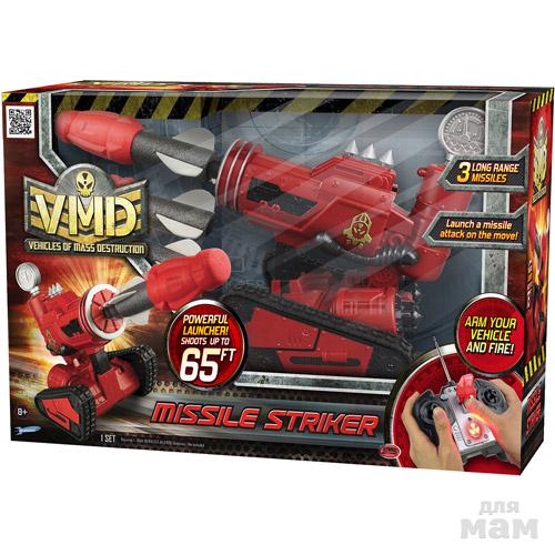 ---Радиоуправляемый танк на гусеницах представляет из себя самую настоящую боевую машину, имя которой - VMD (Vehicles Of Mass Destruction)! В переводе с английского это означает - "машина массового поражения"... и это действительно так! Танк оборудован мощным пусковым устройством, которое стреляет большими ракетами дальнего действия на расстояние до 20 м. В комплекте имеются 3 таких ракеты, выполненные из мягкого вспененного ПВХ-материала.