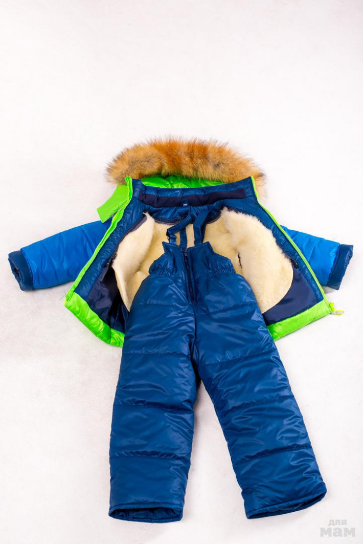 Опушка на капюшоне из натурального меха лисы. Есть меховая подстежка жилетка (искусственная овчина - смесь натур. шерсти и искусств.), капюшон и опушка отстёгиваются. Легкий и очень удобный, отлично подойдёт для активных деток. Длина штанов и рукавов регулируется манжетой. Бретели на штанах также можно регулировать.