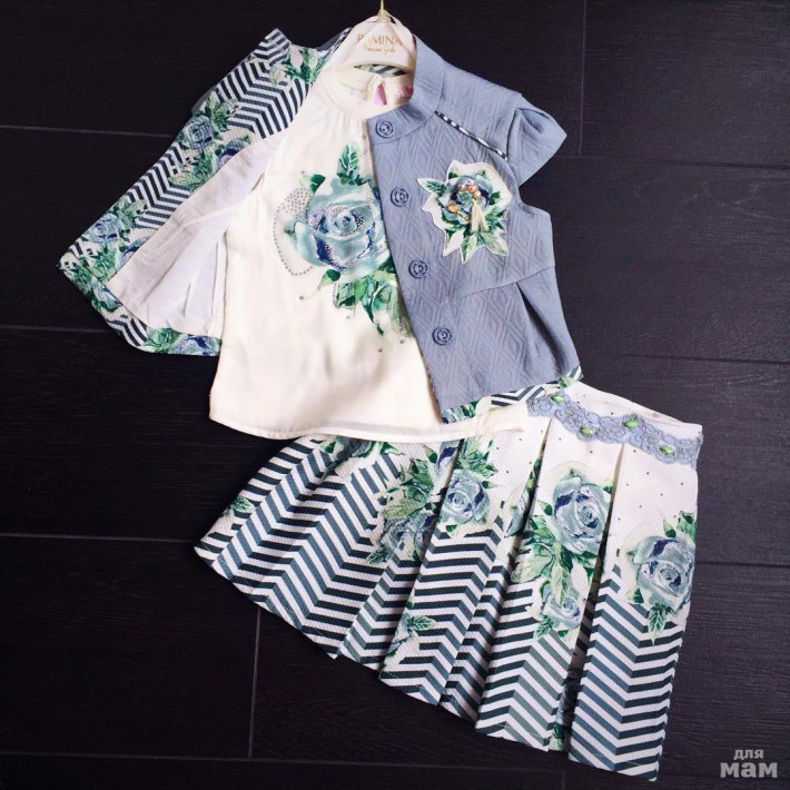 Состоит из трех вещей: юбка, блузка, жакет.