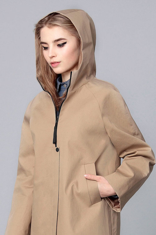 Прямой плащ из водонепроницаемого хлопкового габардина длиной 87 см, рукав покроя реглан 73,0 см. Плащ с капюшоном, центральной застежкой по планке на 2 металлические кнопки и молнию. Перед с нагрудными карманами с листочками. Боковые швы с втачными короткими молниями. Плащ на подкладке.