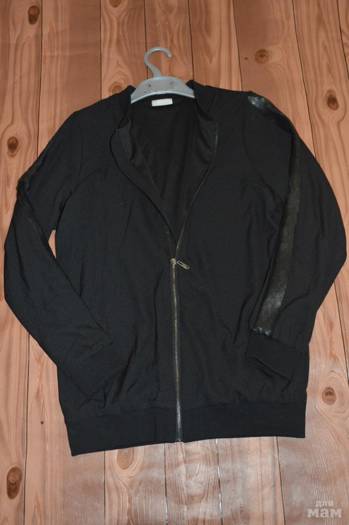 кофточка на молнии маталан, на рукавах по бокам пайетки,есть подкладка.Очень стильная. Размер 13 лет, подойдёт на российский 42 размер. Цена 850 рублей