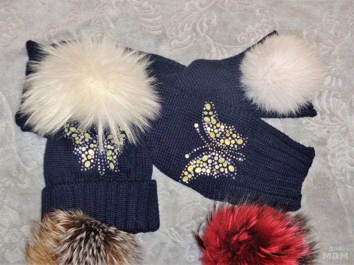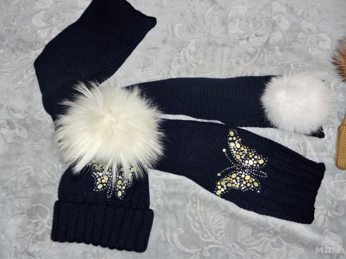 Зимний, т.синий комплект ,состояние идеальное. Два белых помпона.Шарф длинный.Надевали пару раз.