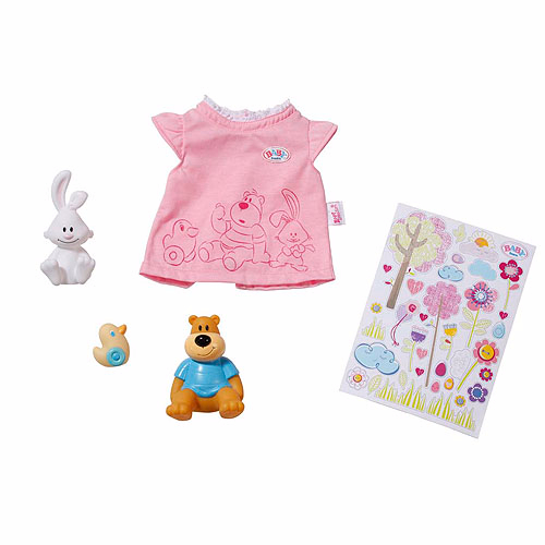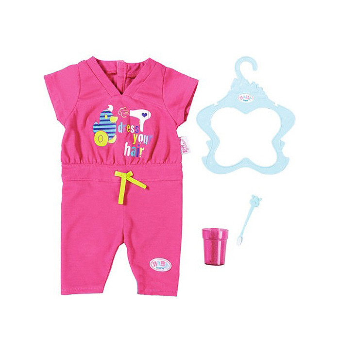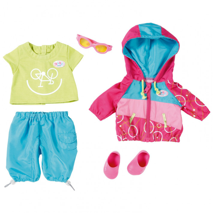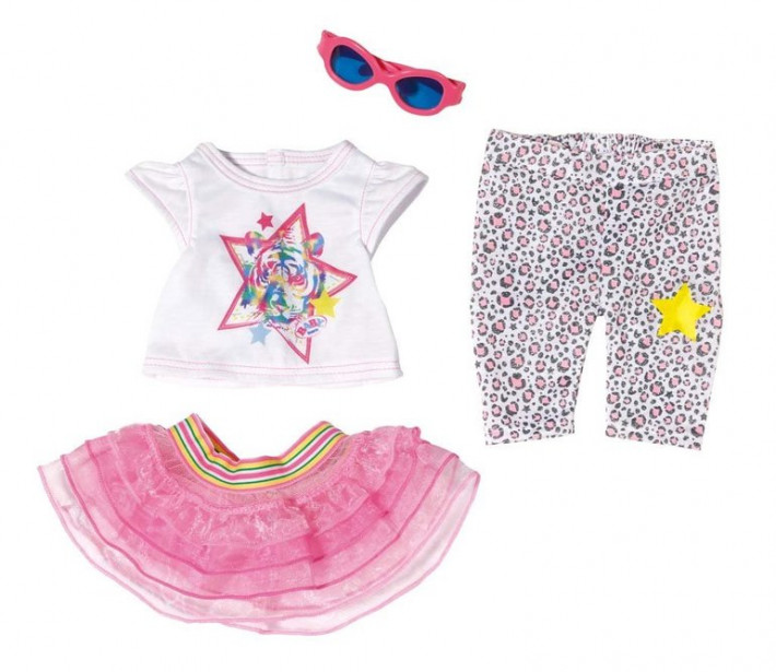 Этот комплект одежды для Baby Born, представленный торговой маркой Zapf Creation, подойдет для куклы, размером не более сорока трех сантиметров. В него входят: футболка, лосины, розовая юбка-пачка и солнцезащитные очки.