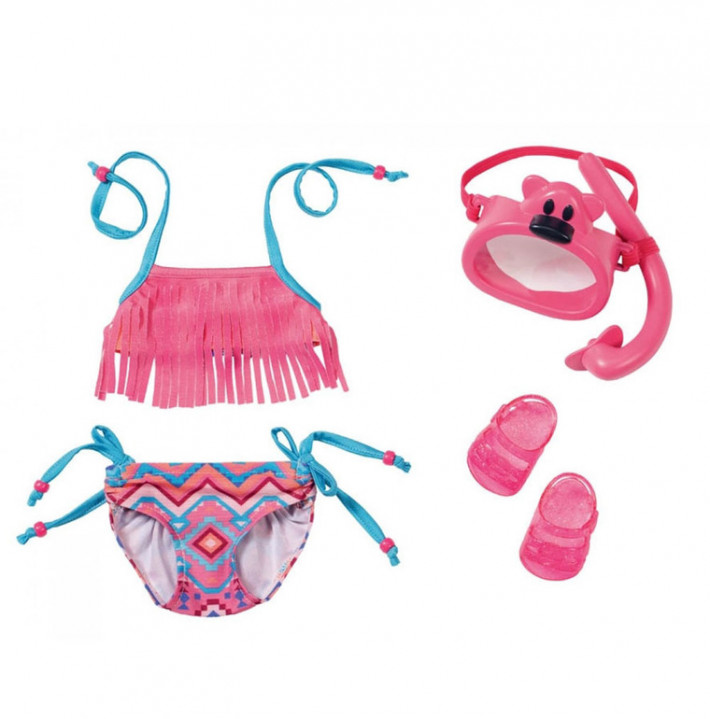 Набор одежды для кукол серии Baby Born "Купальник с аксессуарами" включает в себя раздельный купальник, мягкие туфельки и маску для купания с кислородной трубочкой. Купальник сшит из прочной ткани, а маска и туфельки изготовлены из прочного пластика. Купальник надевается легко и завязывается на веревочки. купальник и аксессуары выполнены в одной цветовой гамме.
