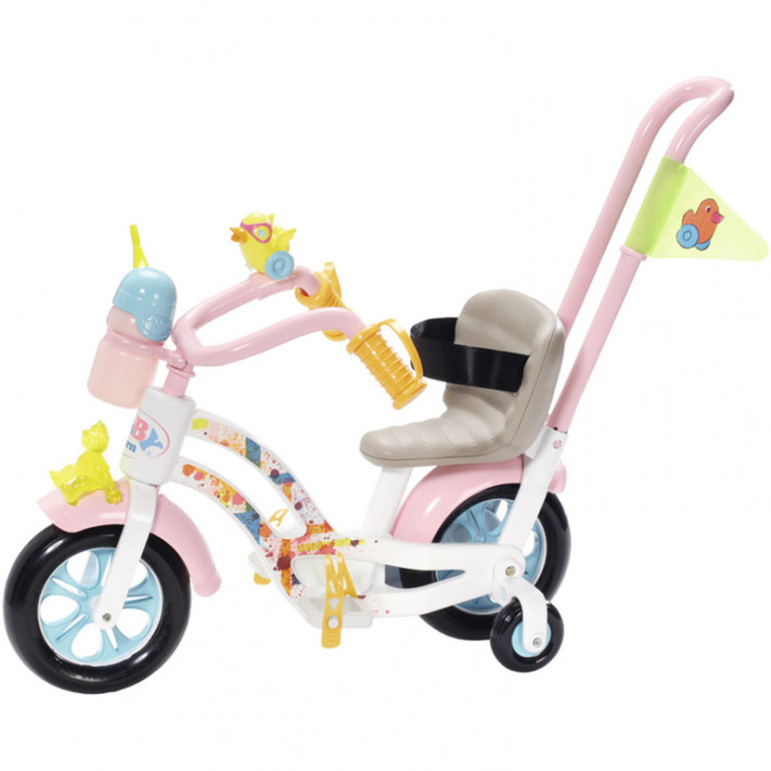 Каркас у велосипеда прочный, выполнен из пластика нежно-розового цвета. Оснащен велосипед двумя большими колесами и парой дополнительных маленьких для большей устойчивости. К тому же у него есть удобная ручка за сидением. Также на велосипеде есть настоящий клаксон в виде уточки, который при нажатии издает гудок, и мигающая лампочка в виде симпатичного медвежонка. Спереди у велосипеда имеется специальный держатель с бутылочкой, из которой можно поить интерактивного пупса Baby Born.